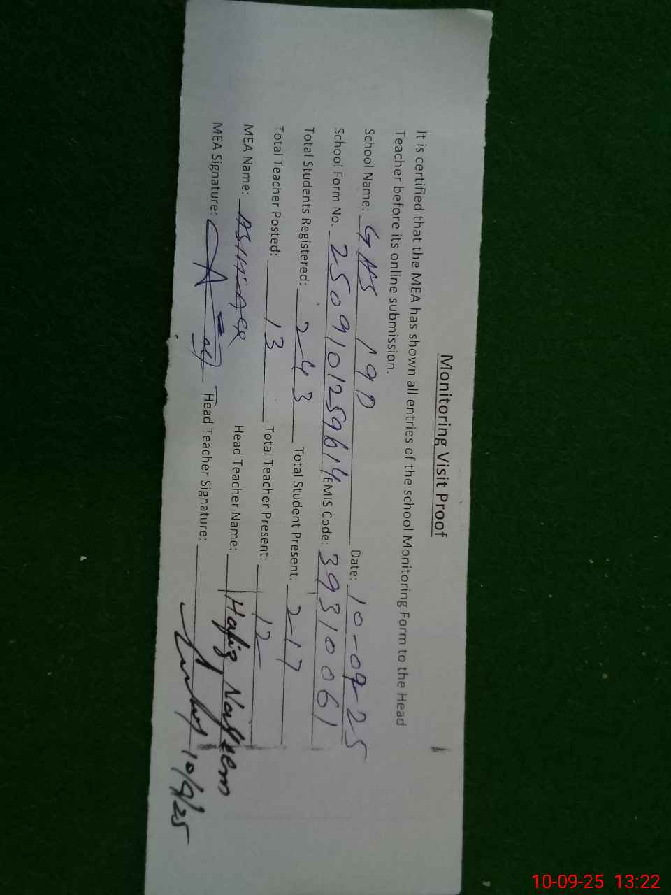 | Certified that this School was Inspected by the Undersigned MEA/DMO Today and the Information Stated Above is as Per Record. | |||||