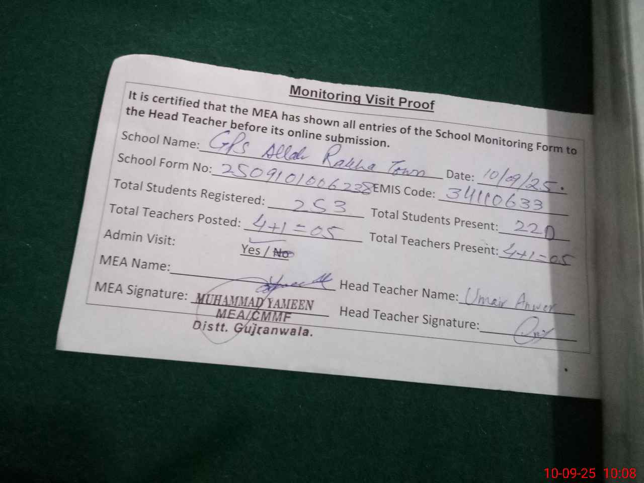 | EMIS Code: 34110633 | Name of School: GPS ALLAH RAKHA TOWN | |||