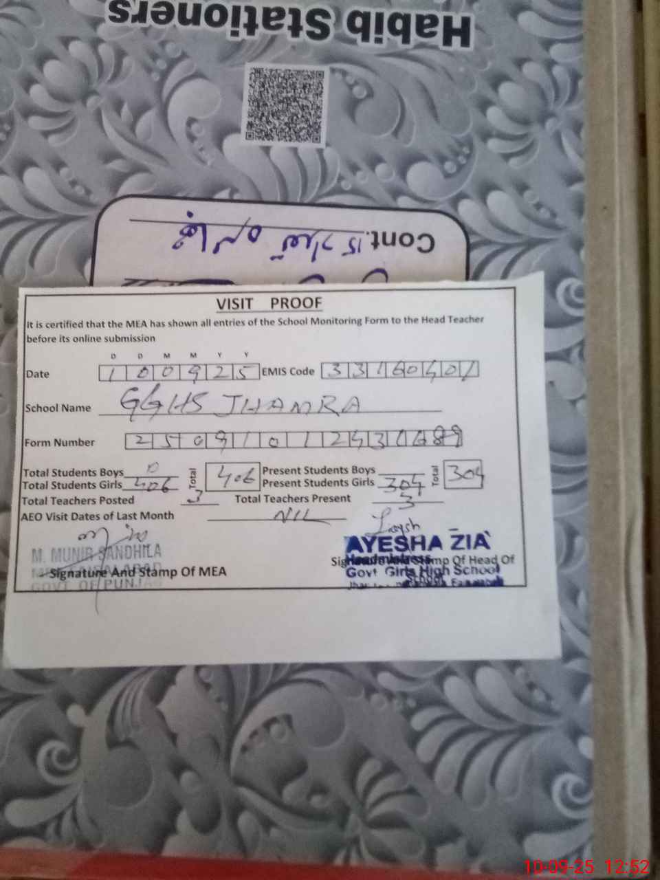 | Certified that this School was Inspected by the Undersigned MEA/DMO Today and the Information Stated Above is as Per Record. | |||||
