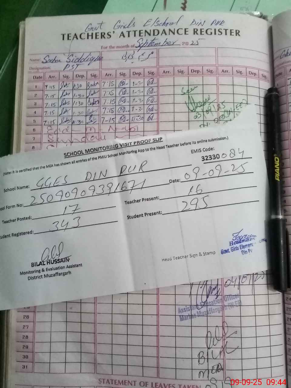 | Attendance Register | Head Teacher | MEA with School | Visit Proof |