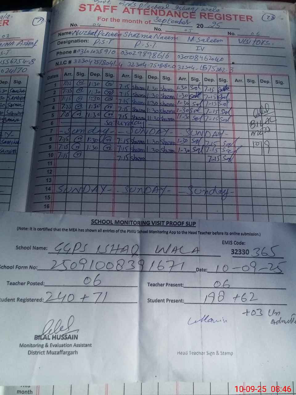| Attendance Register | Head Teacher | MEA with School | Visit Proof |