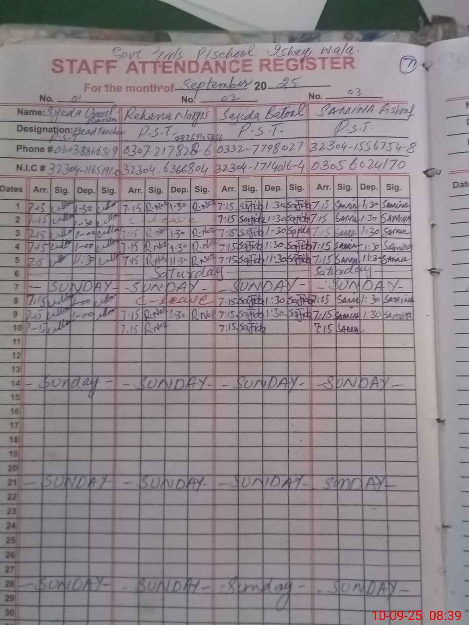 | CNIC | Full Name | Designation | R/C | Absence During Last Calender Month |