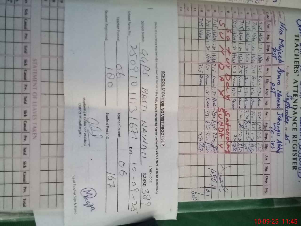 | Attendance Register | Head Teacher | MEA with School | Visit Proof |