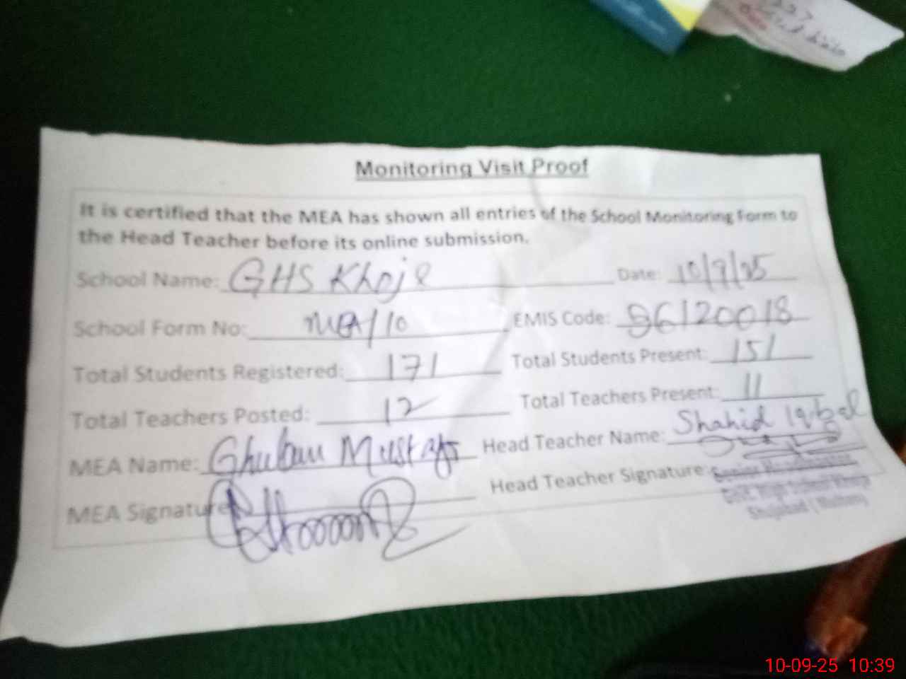 | Monitoring Date: 10-09-2025 | Start Time: 10-09-2025 09:51 AM | End Time: 10-09-2025 10:39 AM | Name of MEA: GH**** MU**** | |
