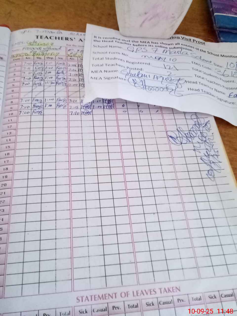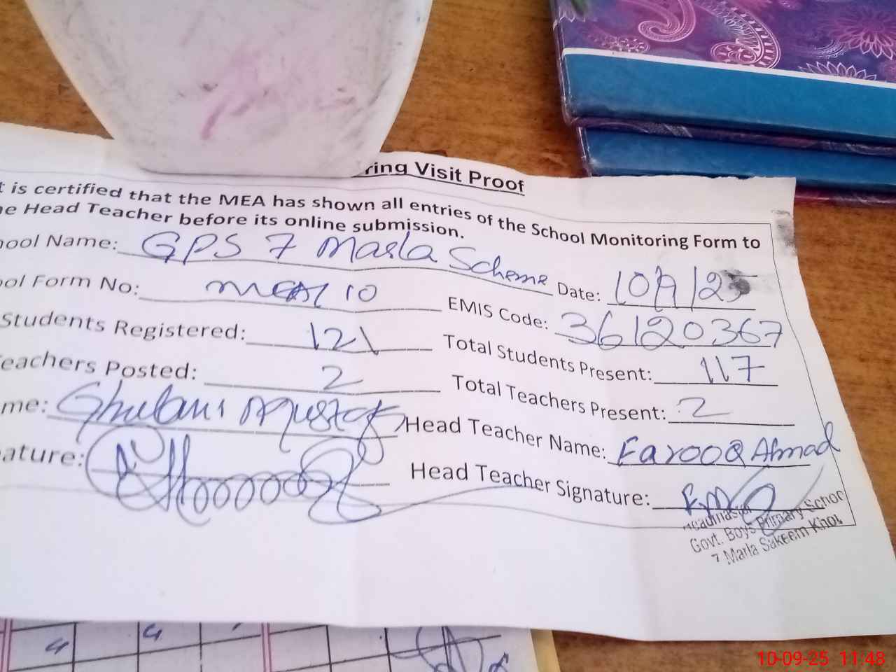 | Attendance Register | Head Teacher | MEA with School | Visit Proof |