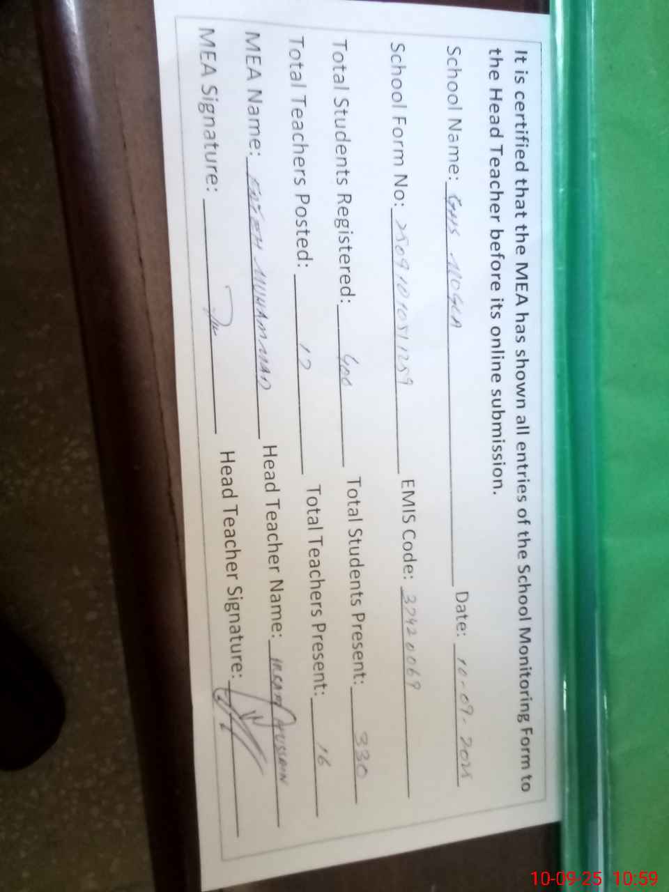 | Certified that this School was Inspected by the Undersigned MEA/DMO Today and the Information Stated Above is as Per Record. | |||||