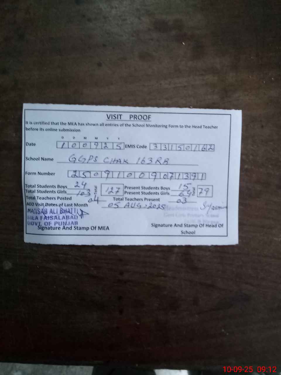 | Attendance Register | Head Teacher | MEA with School | Visit Proof |
