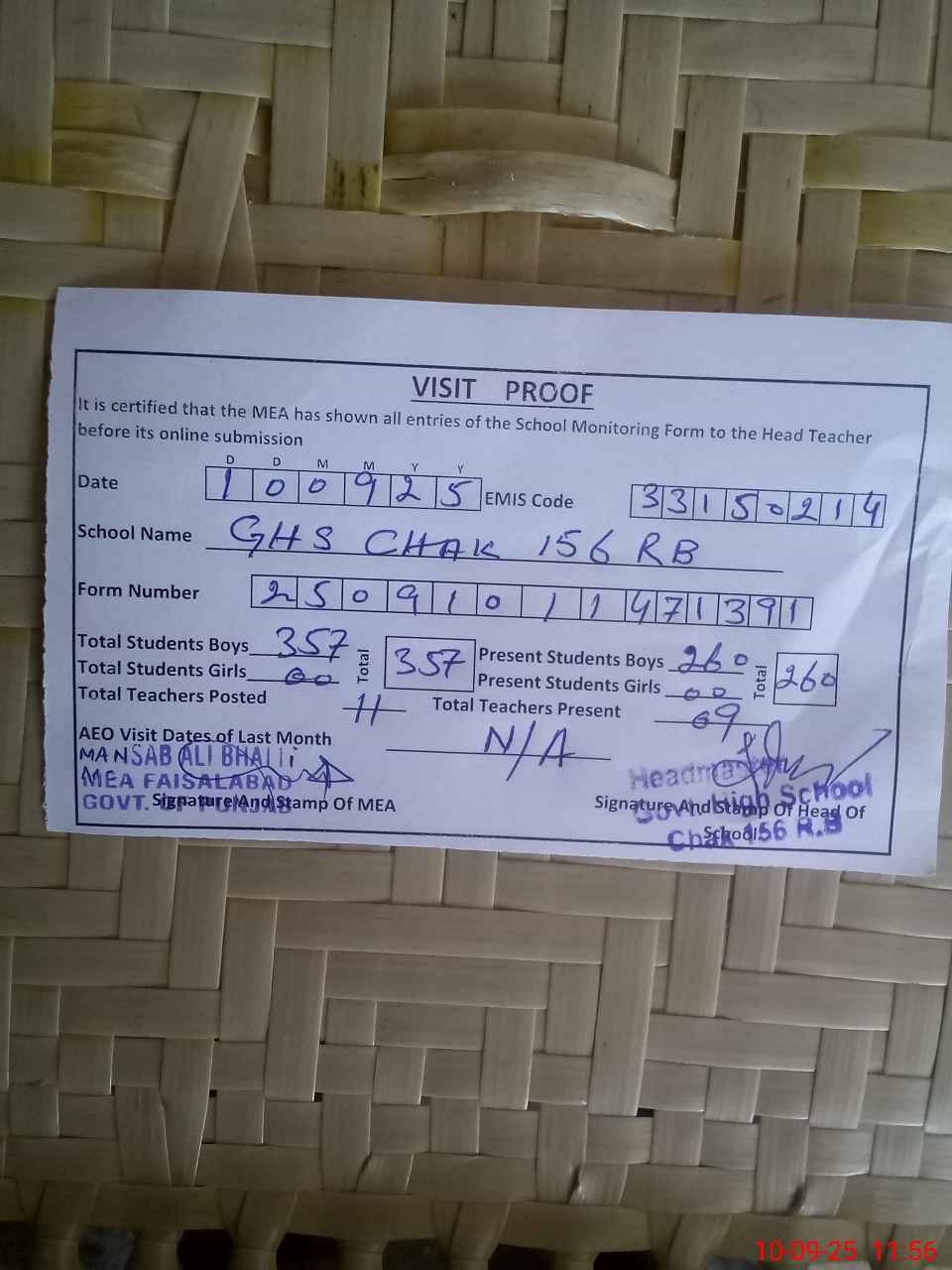 | EMIS Code: 33150214 | Name of School: GHS CHAK 156 RB CHAK JHUMRA FSD | |||