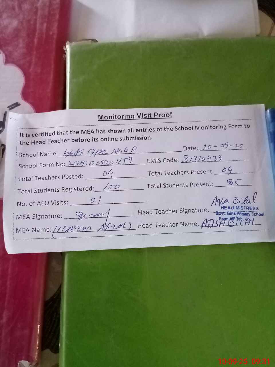 | EMIS Code: 31310439 | Name of School: GGPS CHAK NO 4/P | |||