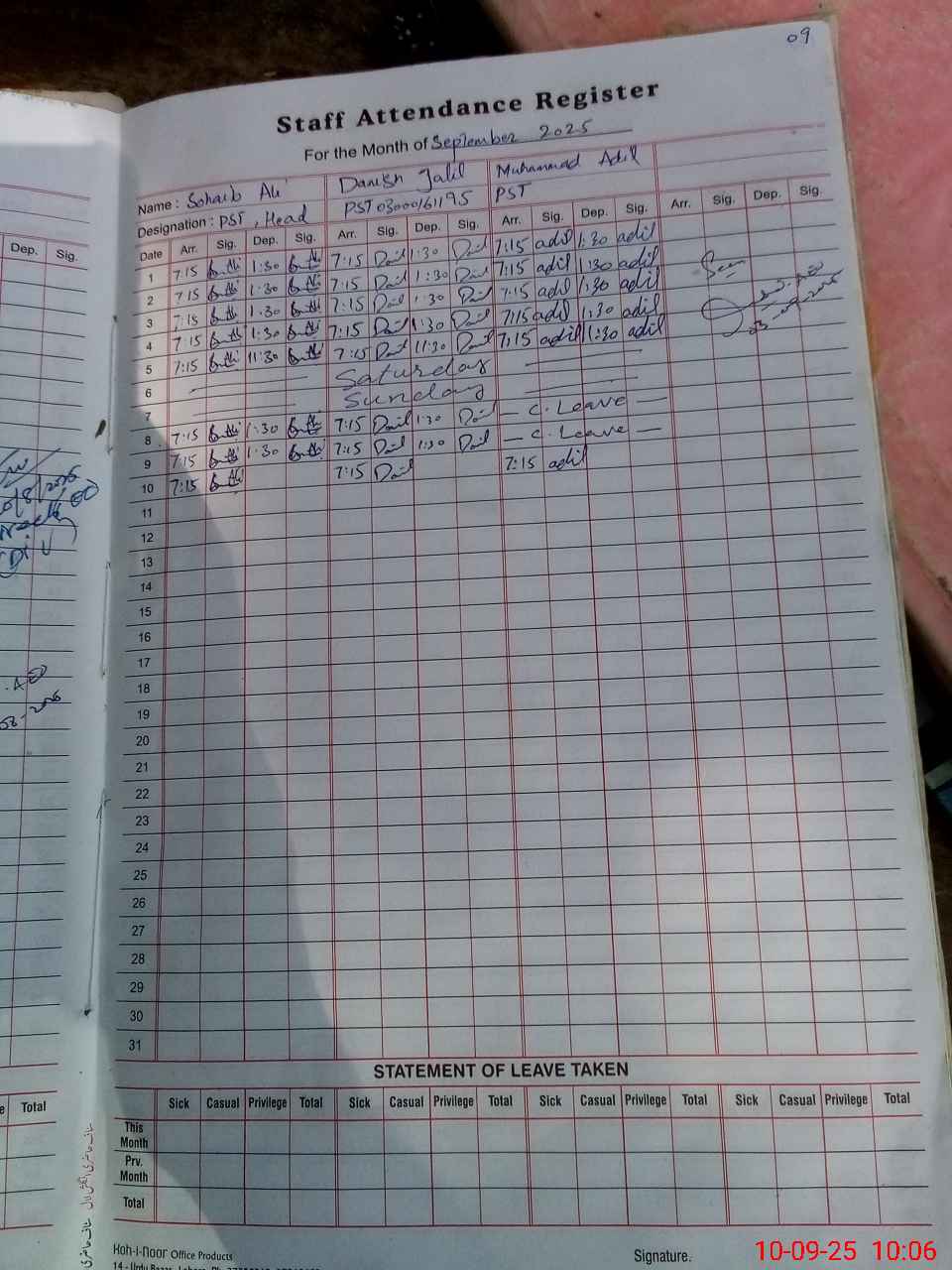 | CNIC | Full Name | Designation | R/C | Absence During Last Calender Month |