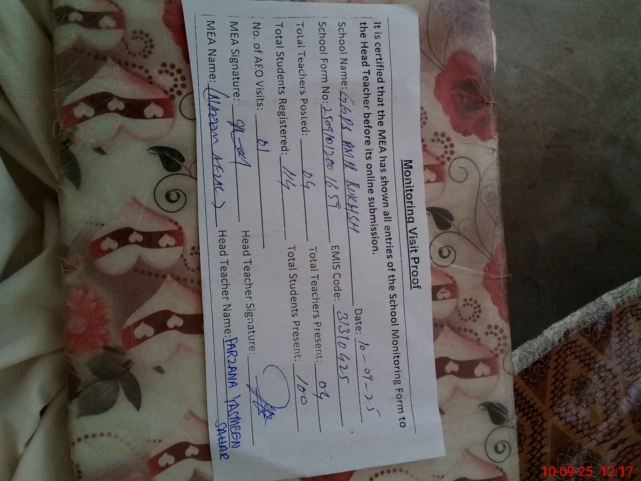 | Attendance Register | Head Teacher | MEA with School | Visit Proof |