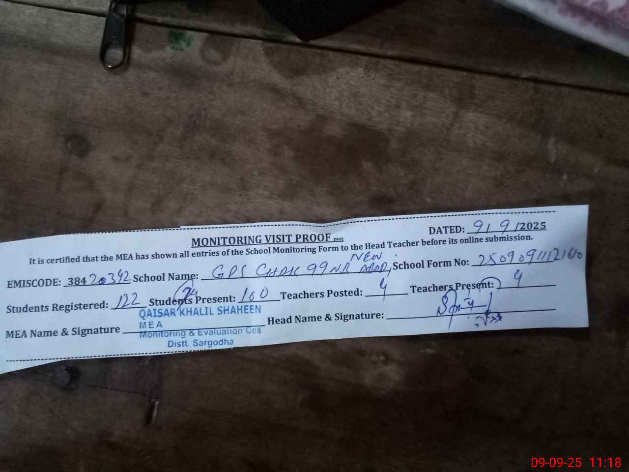 | Attendance Register | Head Teacher | MEA with School | Visit Proof |