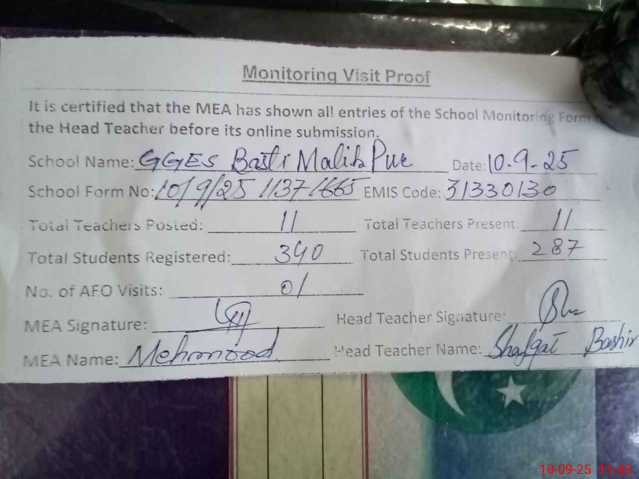 | Monitoring Date: 10-09-2025 | Start Time: 10-09-2025 11:19 AM | End Time: 10-09-2025 11:44 AM | Name of MEA: Ma**** UlHa**** | |
