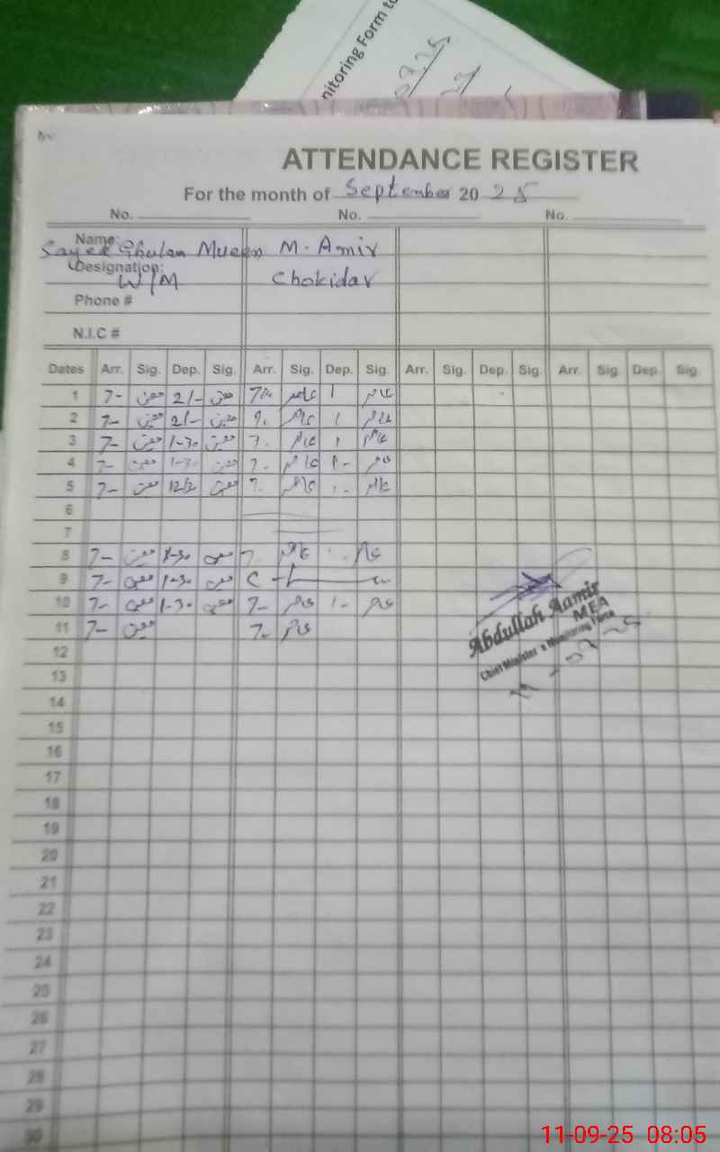 | Monitoring Date: 11-09-2025 | Start Time: 11-09-2025 07:59 AM | End Time: 11-09-2025 08:36 AM | Name of MEA: AB**** AA**** | |