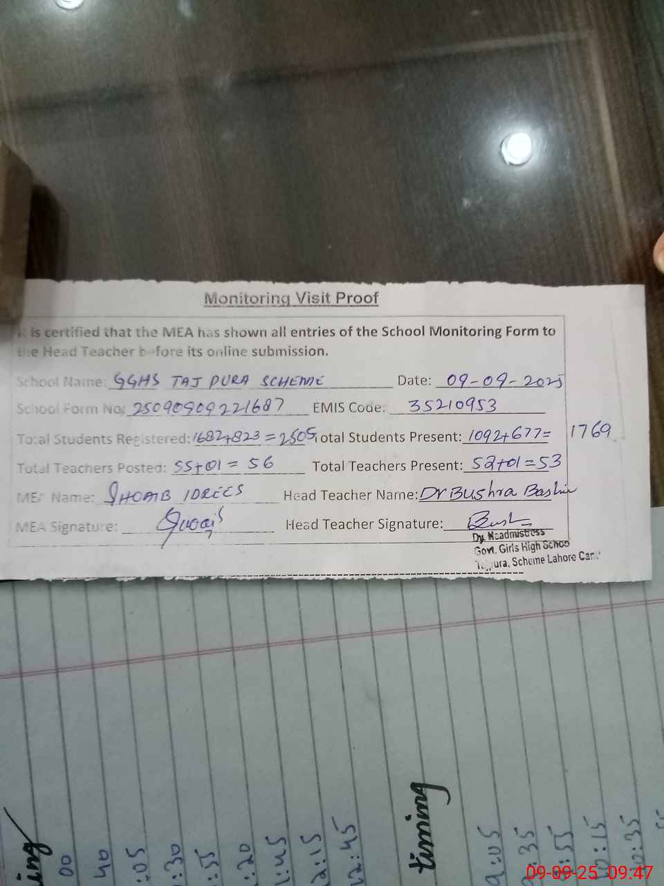 | Attendance Register | Head Teacher | MEA with School | Visit Proof |