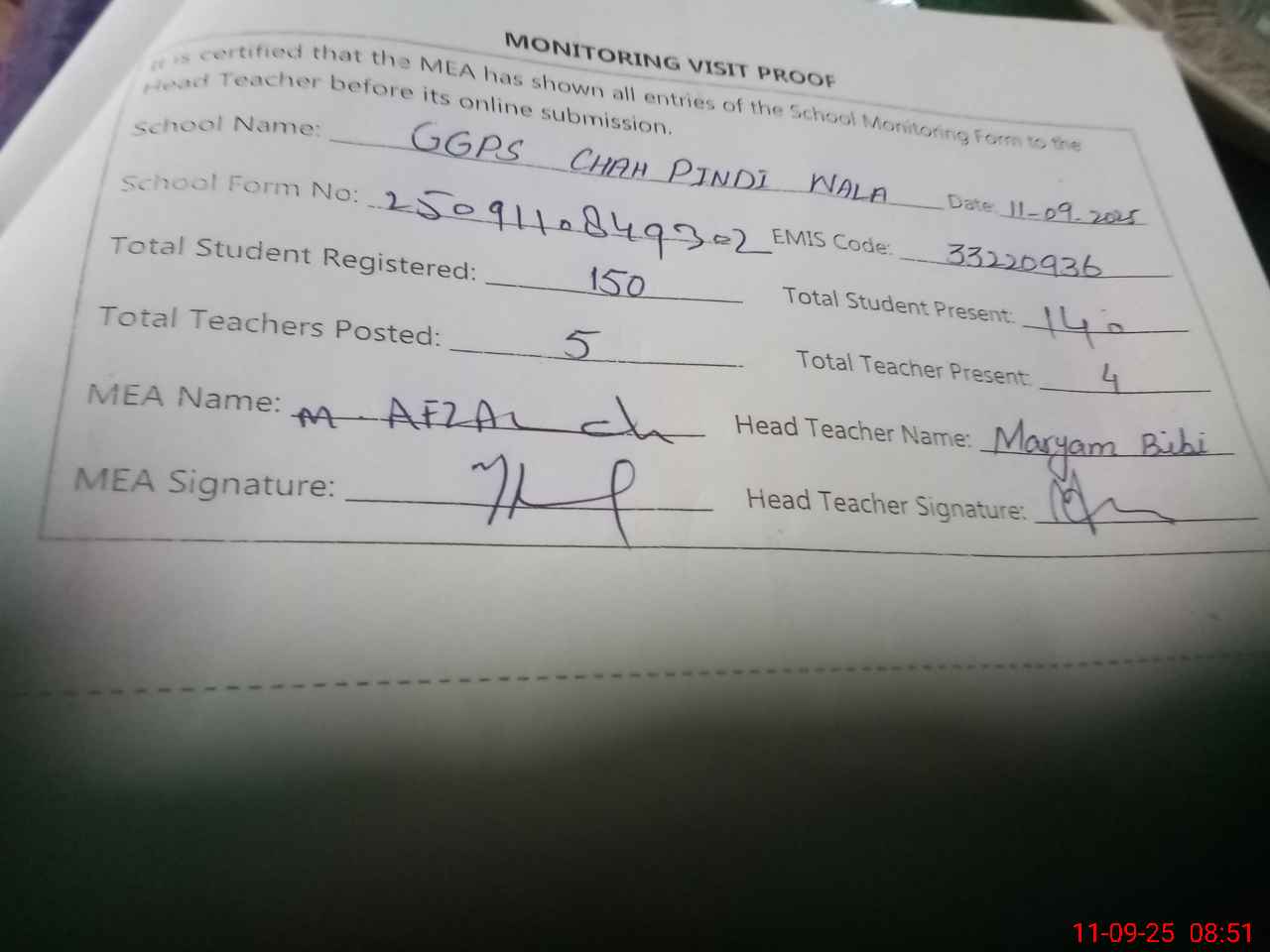 | Attendance Register | Head Teacher | MEA with School | Visit Proof |