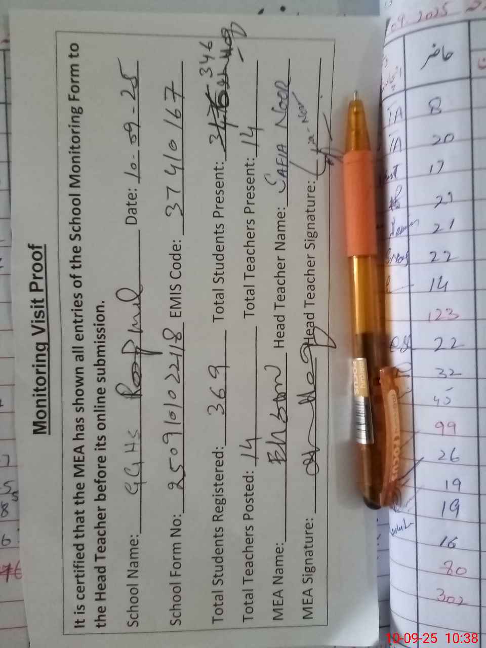 | Attendance Register | Head Teacher | MEA with School | Visit Proof |