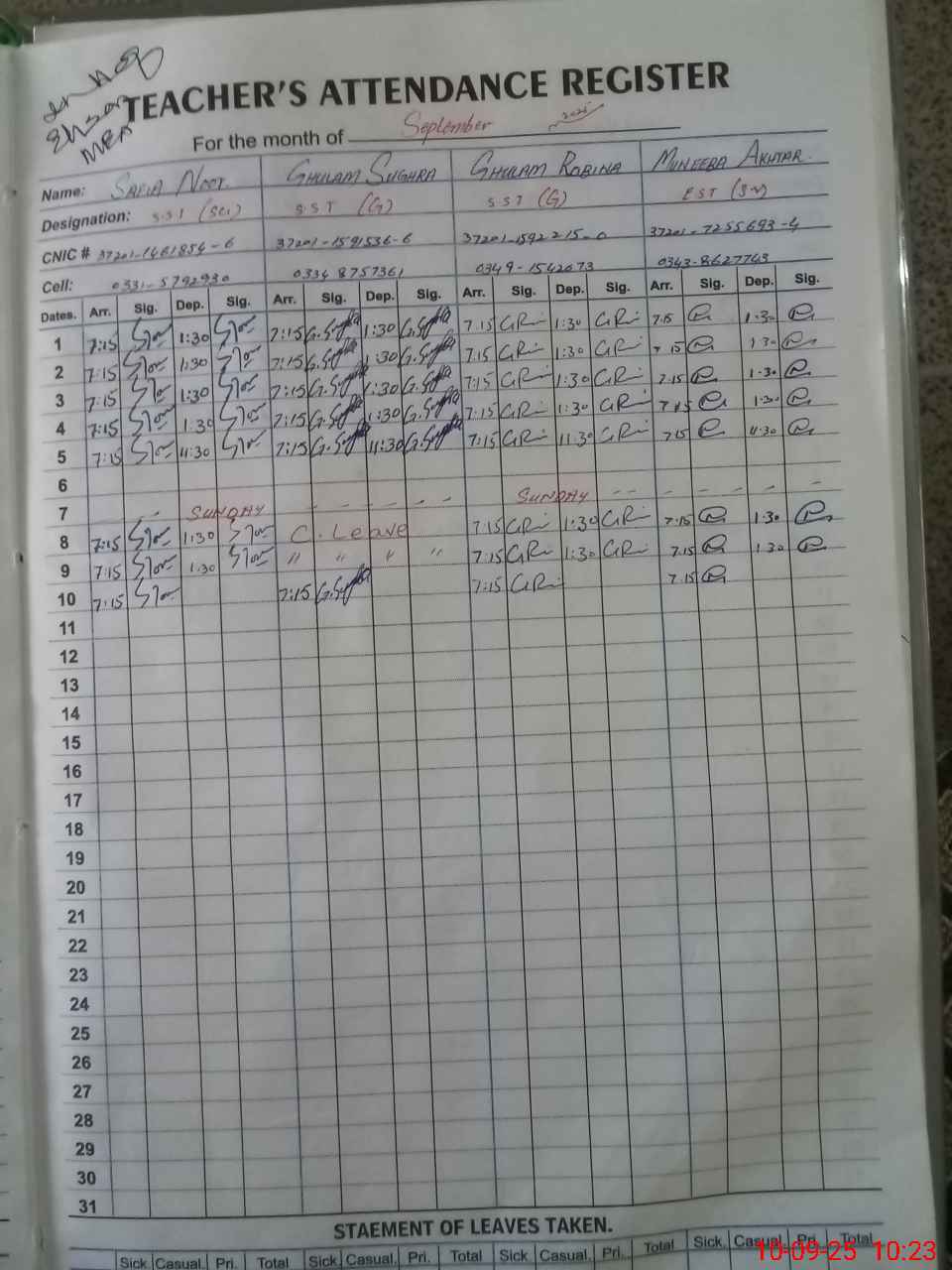 | CNIC | Full Name | Designation | R/C | Absence During Last Calender Month |