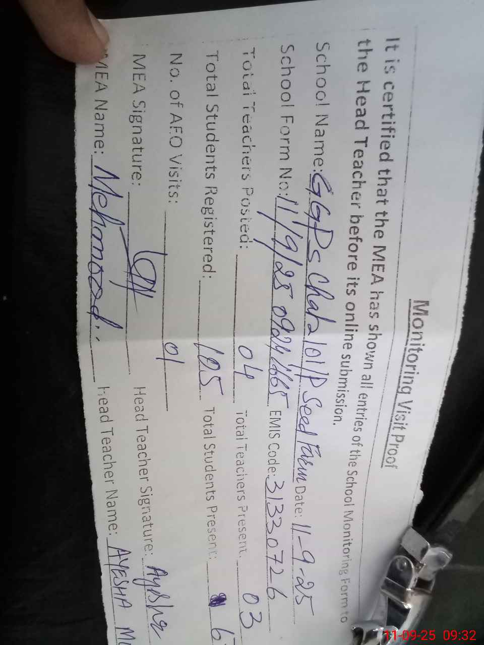 | Monitoring Date: 11-09-2025 | Start Time: 11-09-2025 08:55 AM | End Time: 11-09-2025 09:32 AM | Name of MEA: Ma**** UlHa**** | |