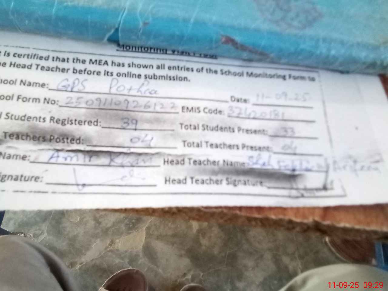 | Name: Sh**** Fa**** UlAr**** Designation: (School Headmaster's/Headmistress's) PST Phone/Cell Number: 03**** |