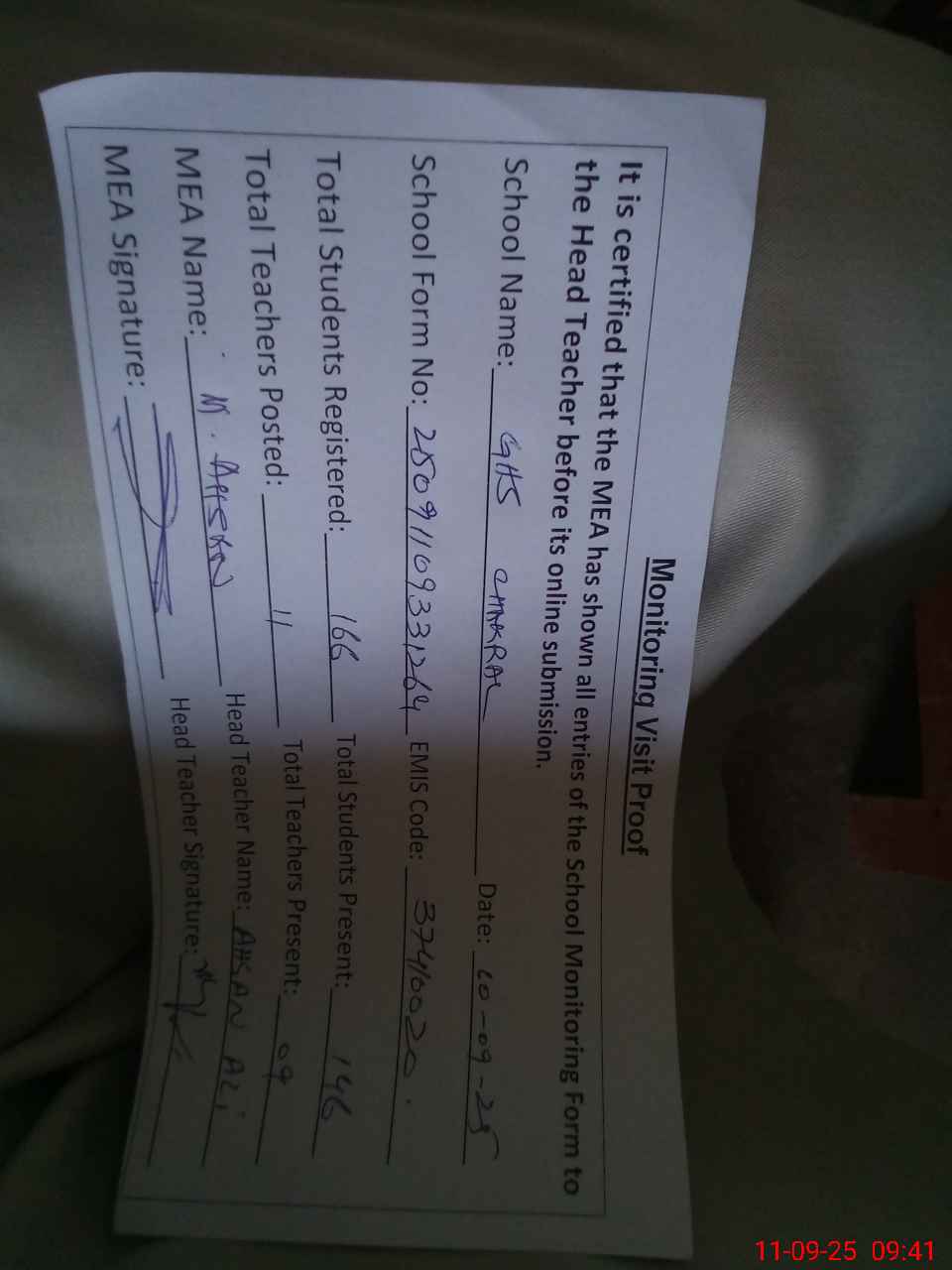 | Attendance Register | Head Teacher | MEA with School | Visit Proof |
