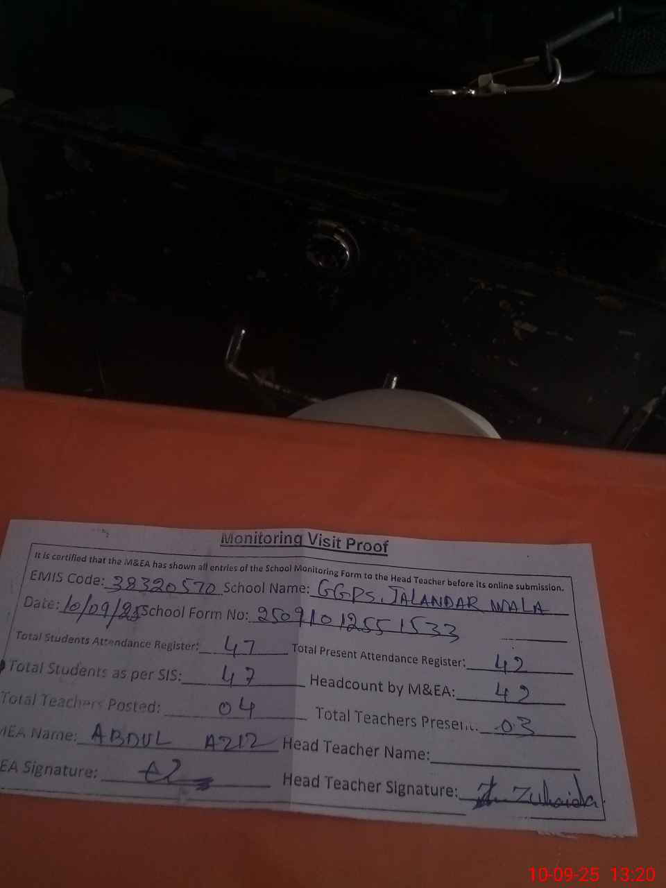 | Attendance Register | Head Teacher | MEA with School | Visit Proof |