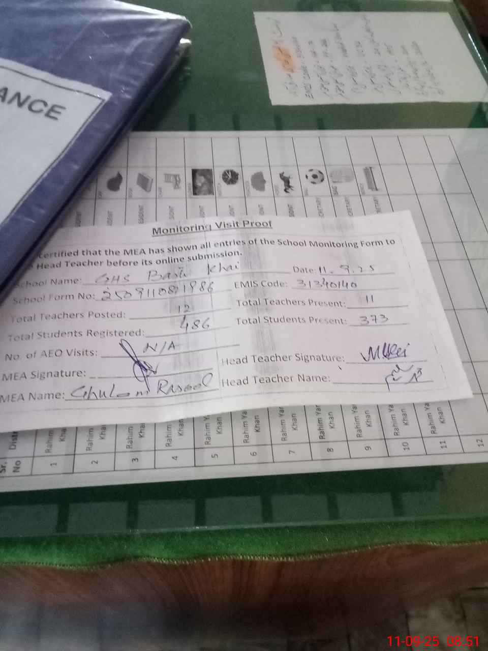 | Attendance Register | Head Teacher | MEA with School | Visit Proof |