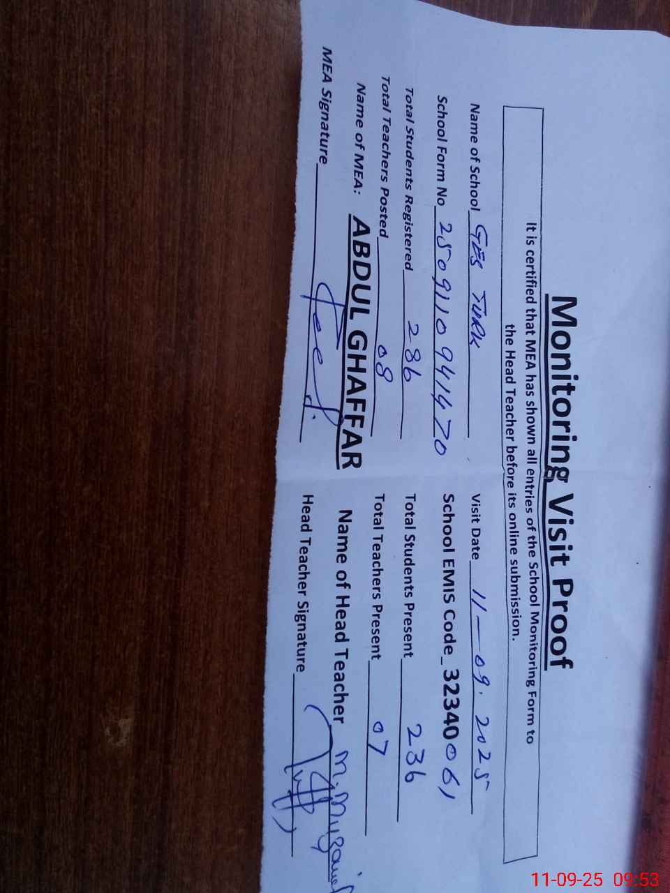 | Attendance Register | Head Teacher | MEA with School | Visit Proof |