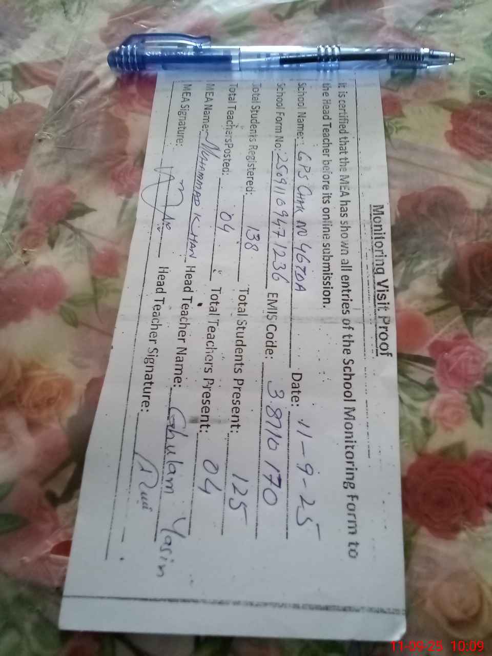 | Attendance Register | Head Teacher | MEA with School | Visit Proof |