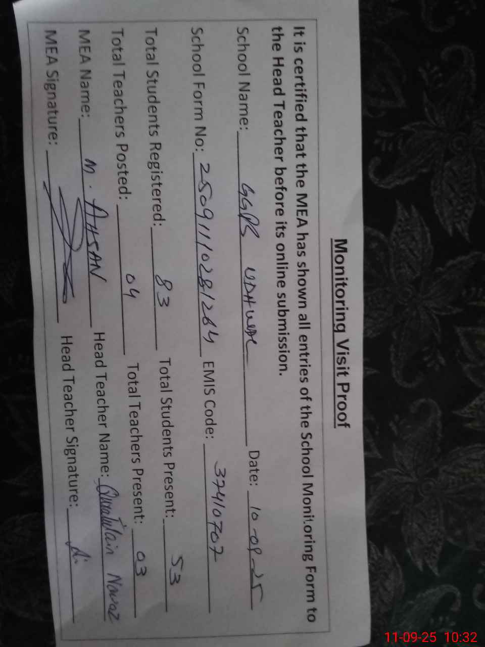 | Certified that this School was Inspected by the Undersigned MEA/DMO Today and the Information Stated Above is as Per Record. | |||||