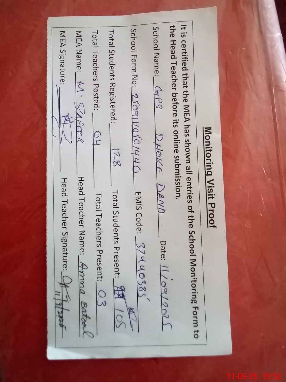 | Attendance Register | Head Teacher | MEA with School | Visit Proof |