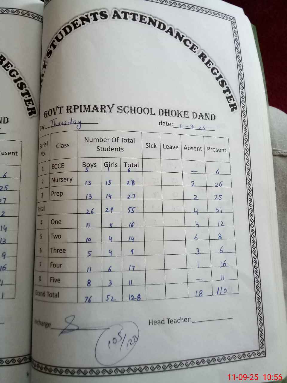 | Total Students Present | 6 | 0 | 46 | 13 | 9 | 5 | 15 | 11 | 105 | |||||||