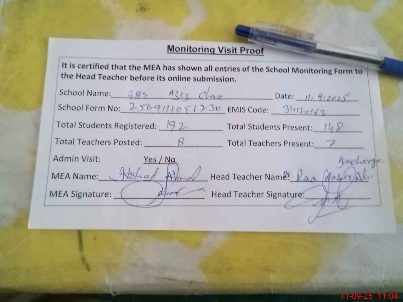 | Attendance Register | Head Teacher | MEA with School | Visit Proof |