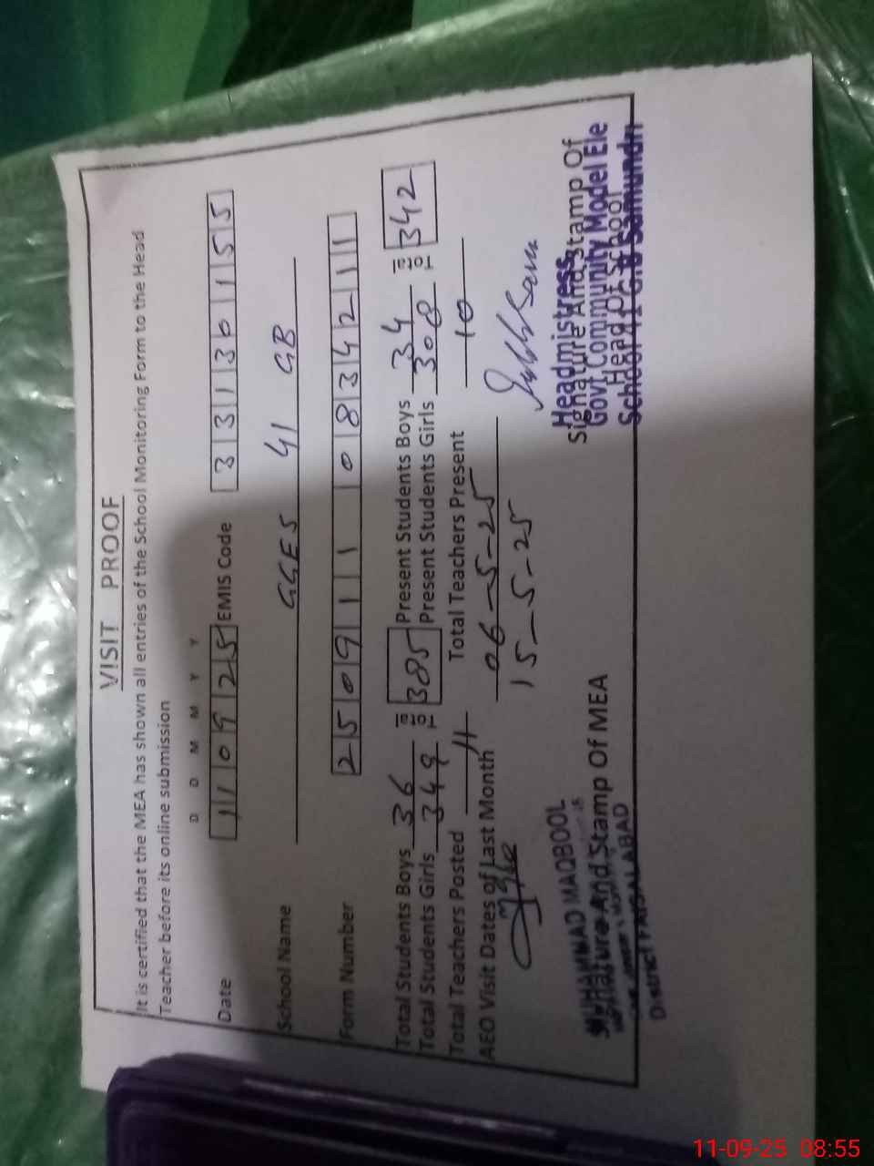 | Attendance Register | Head Teacher | MEA with School | Visit Proof |