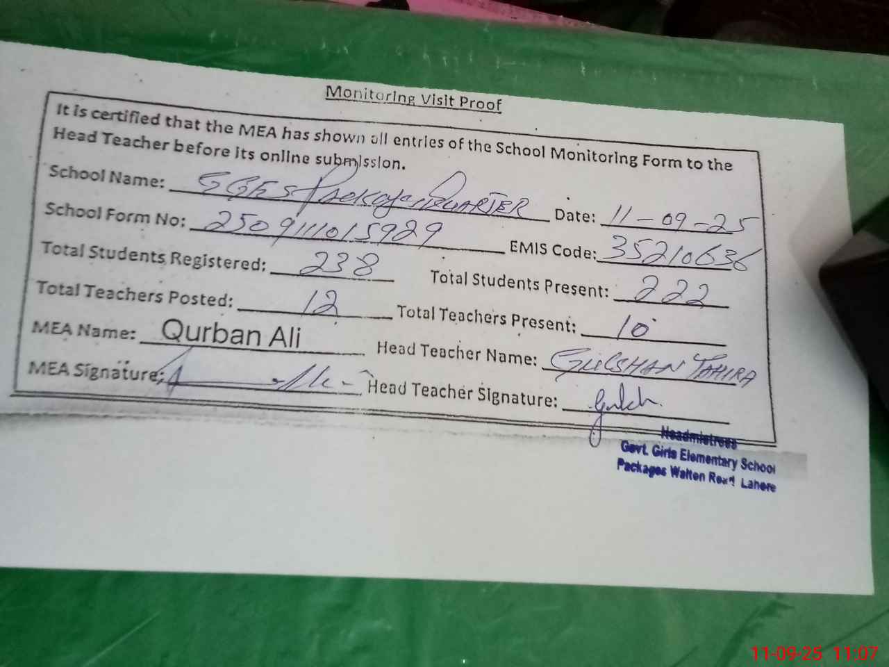 | EMIS Code: 35210636 | Name of School: GGES PACKAGES QUARTERS, WALTON ROAD, LAHORE | |||