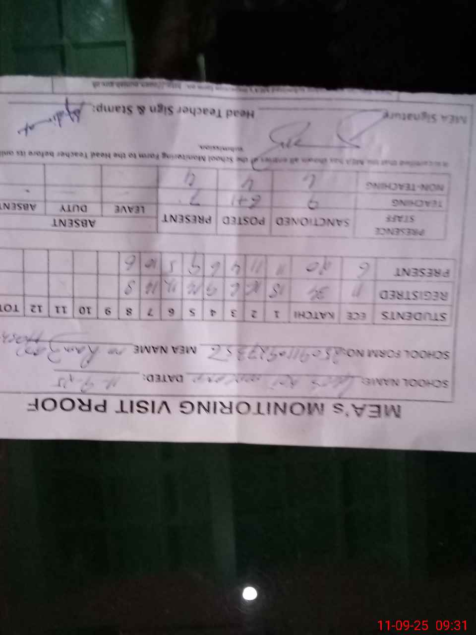 | Attendance Register | Head Teacher | MEA with School | Visit Proof |
