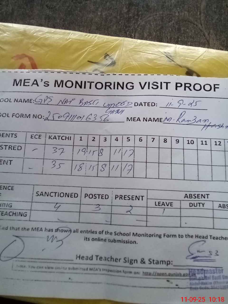 | Attendance Register | Head Teacher | MEA with School | Visit Proof |