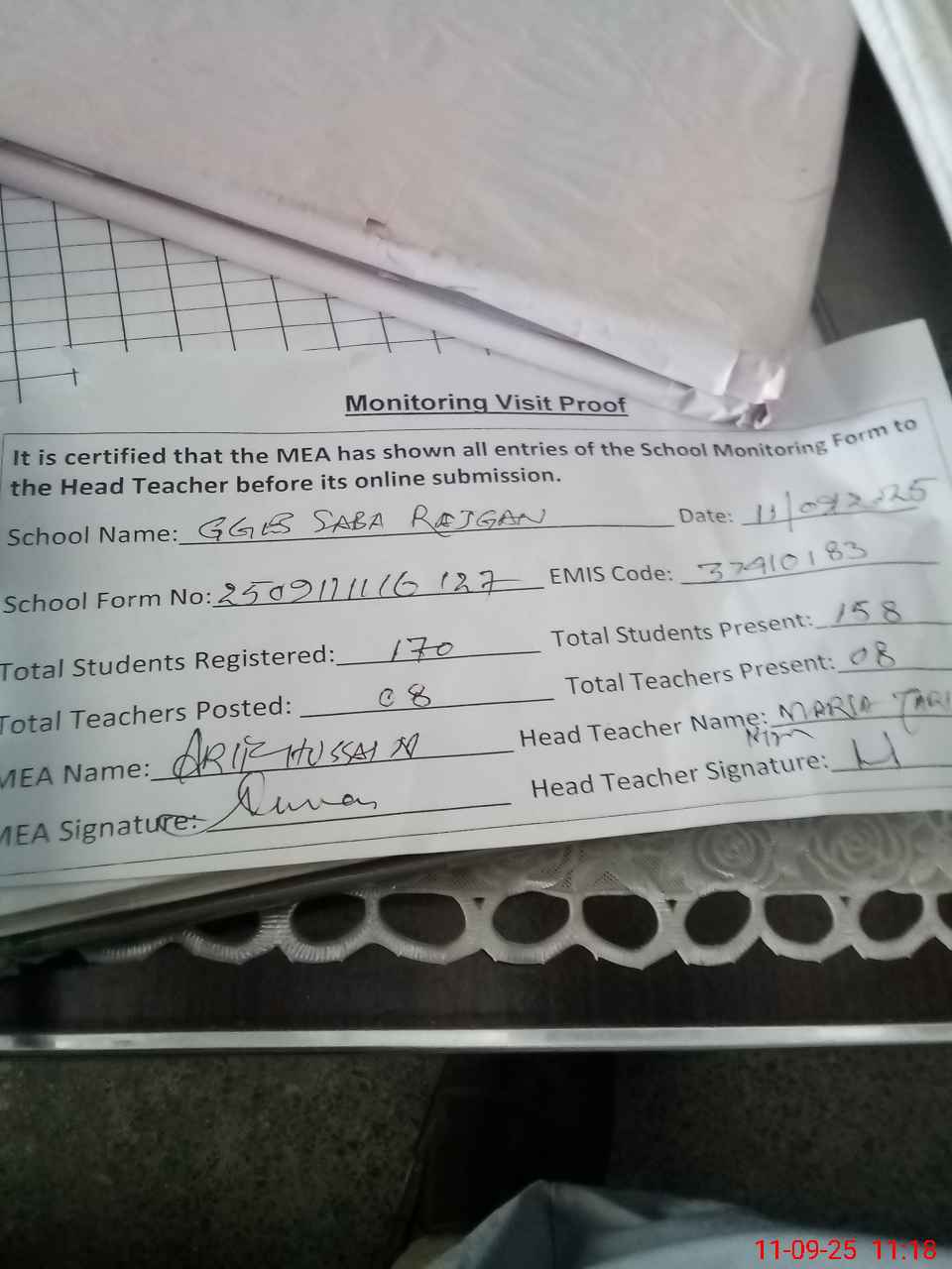 | Attendance Register | Head Teacher | MEA with School | Visit Proof |