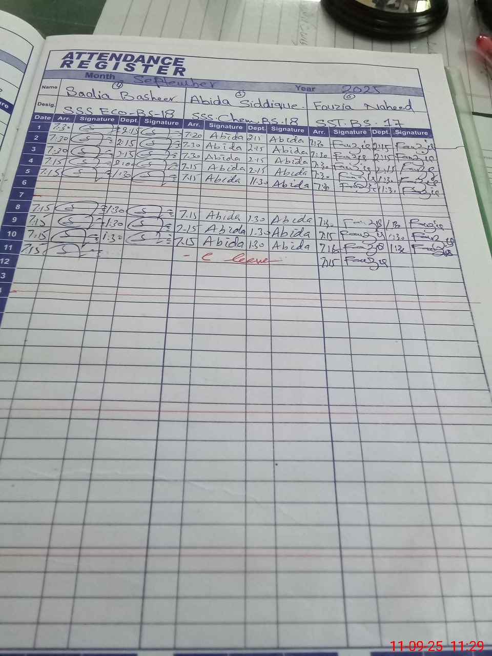 | CNIC | Full Name | Designation | R/C | Absence During Last Calender Month |