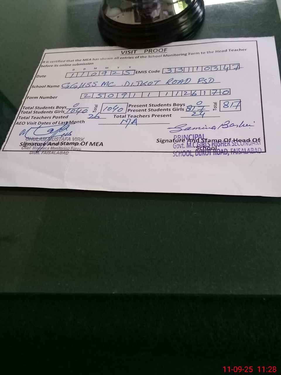 | Attendance Register | Head Teacher | MEA with School | Visit Proof |