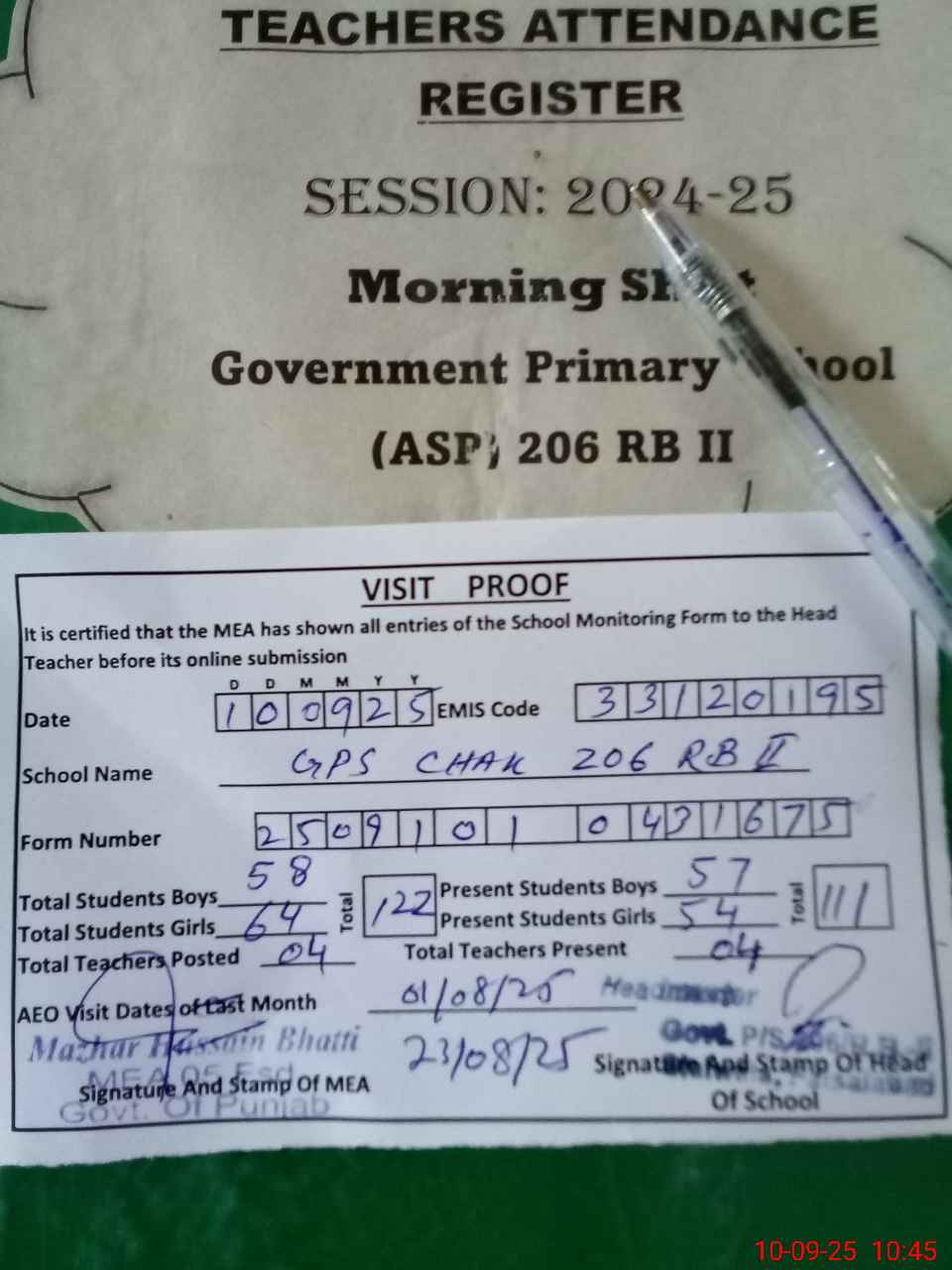 | EMIS Code: 33120195 | Name of School: GPS CHAK 206 RB II | |||