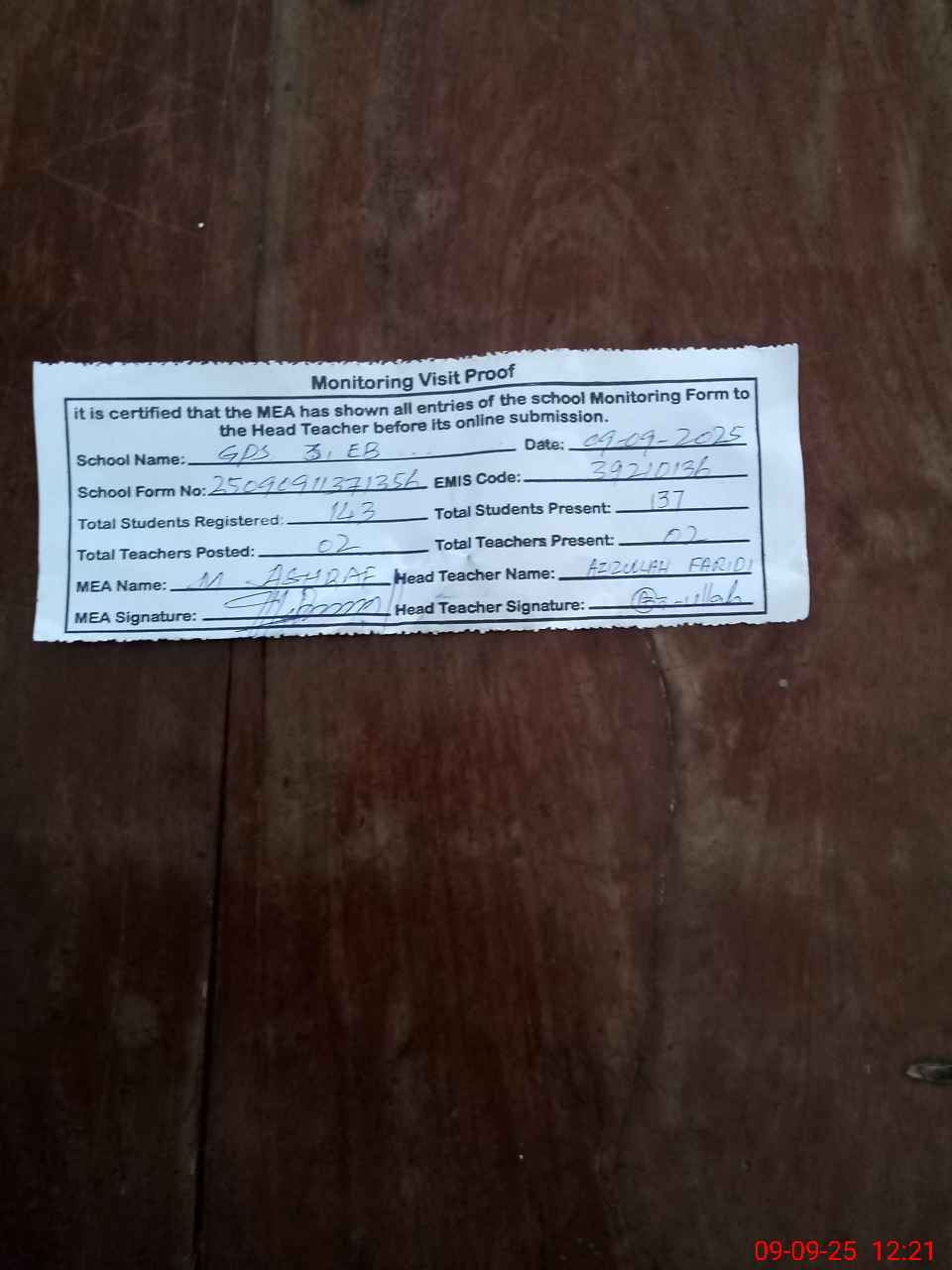 | Attendance Register | Head Teacher | MEA with School | Visit Proof |