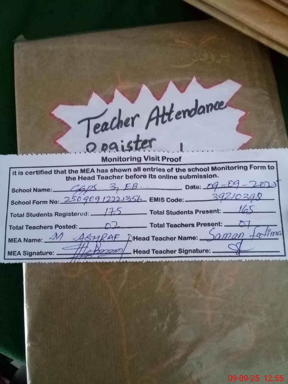 | Attendance Register | Head Teacher | MEA with School | Visit Proof |