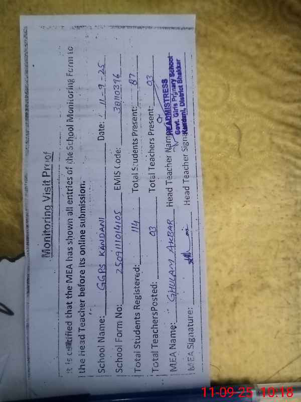 | Monitoring Date: 11-09-2025 | Start Time: 11-09-2025 10:03 AM | End Time: 11-09-2025 10:20 AM | Name of MEA: Gh**** Ak**** Kh**** | |