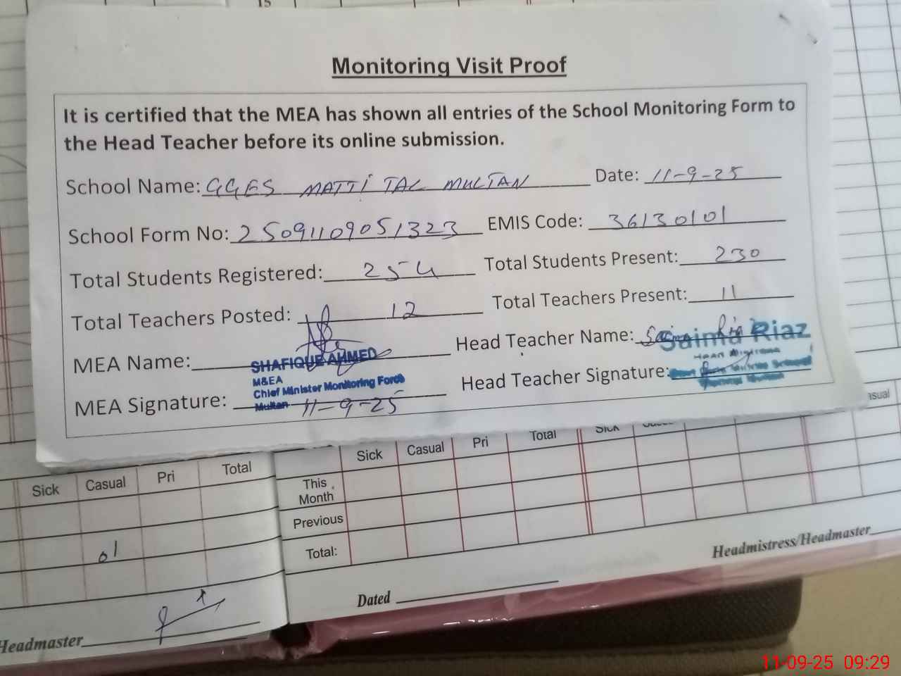 | Attendance Register | Head Teacher | MEA with School | Visit Proof |