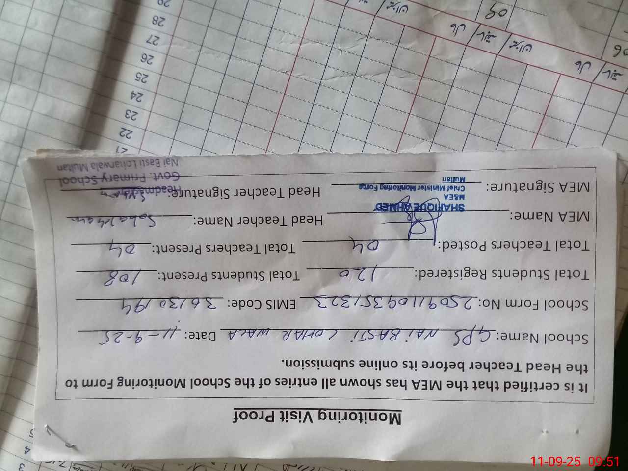 | Monitoring Date: 11-09-2025 | Start Time: 11-09-2025 09:35 AM | End Time: 11-09-2025 09:51 AM | Name of MEA: SH**** AH**** | |