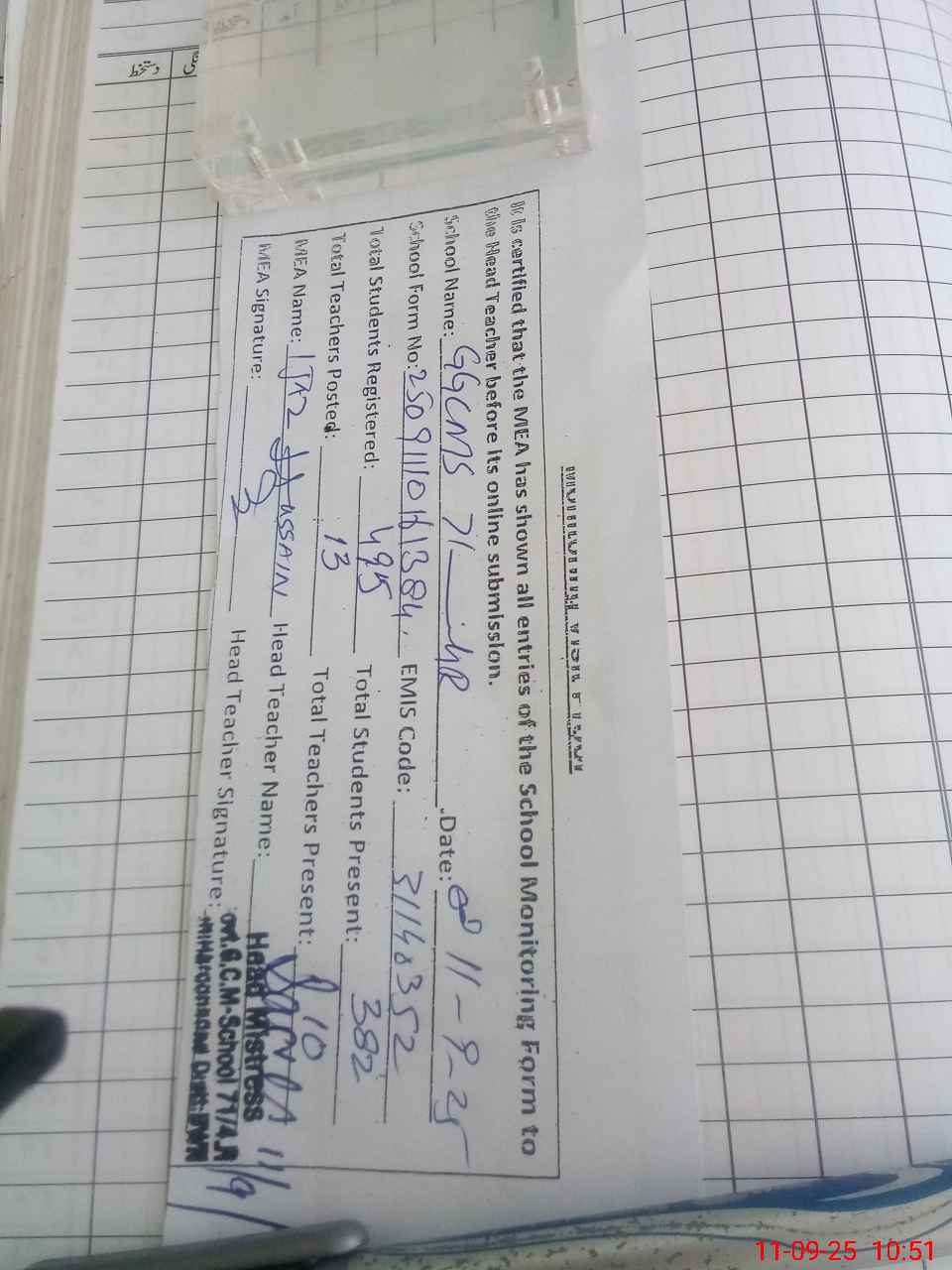 | Certified that this School was Inspected by the Undersigned MEA/DMO Today and the Information Stated Above is as Per Record. | |||||