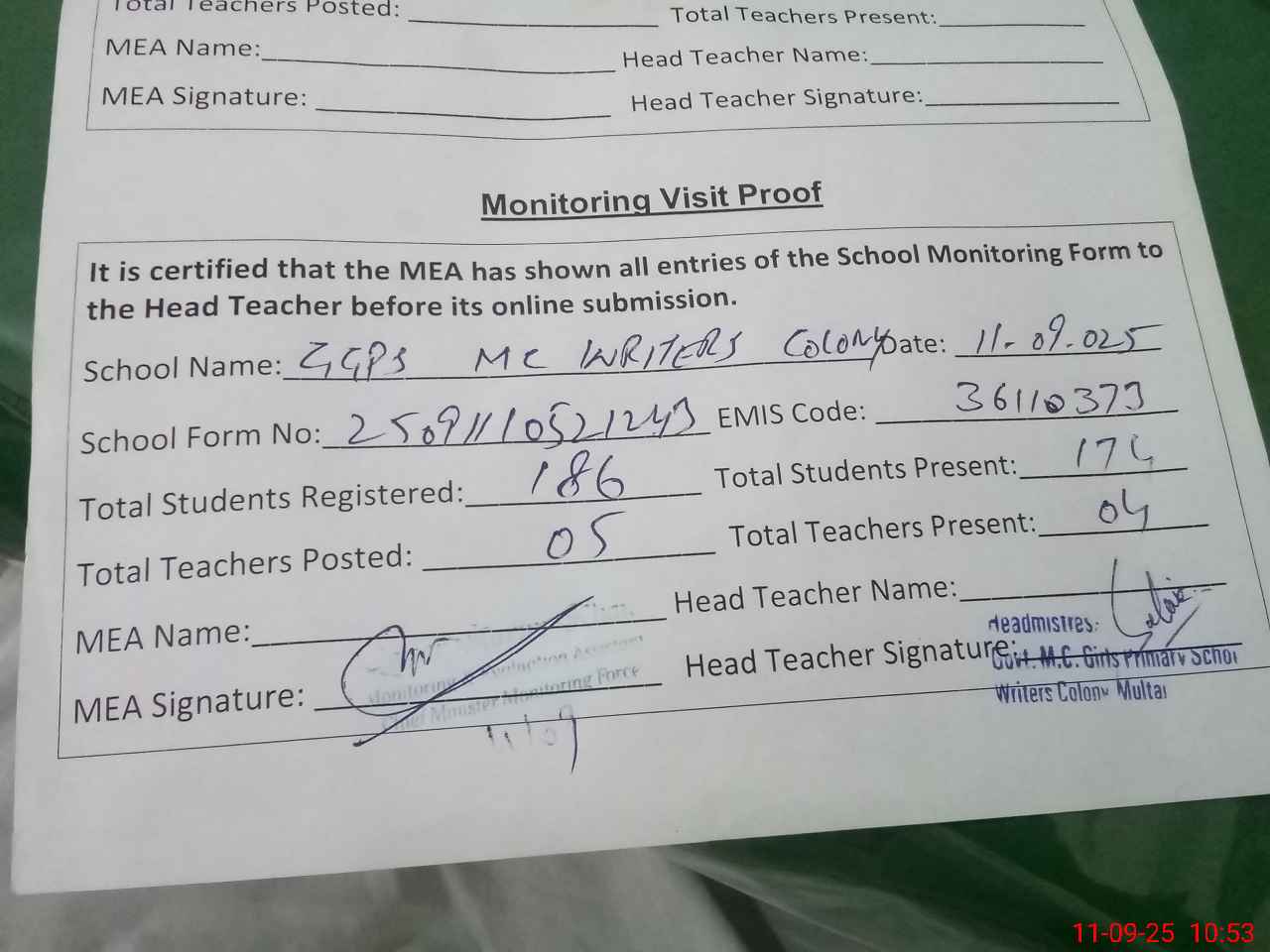 | EMIS Code: 36110373 | Name of School: GGPS MC WRITERS COLONY MULTAN | |||