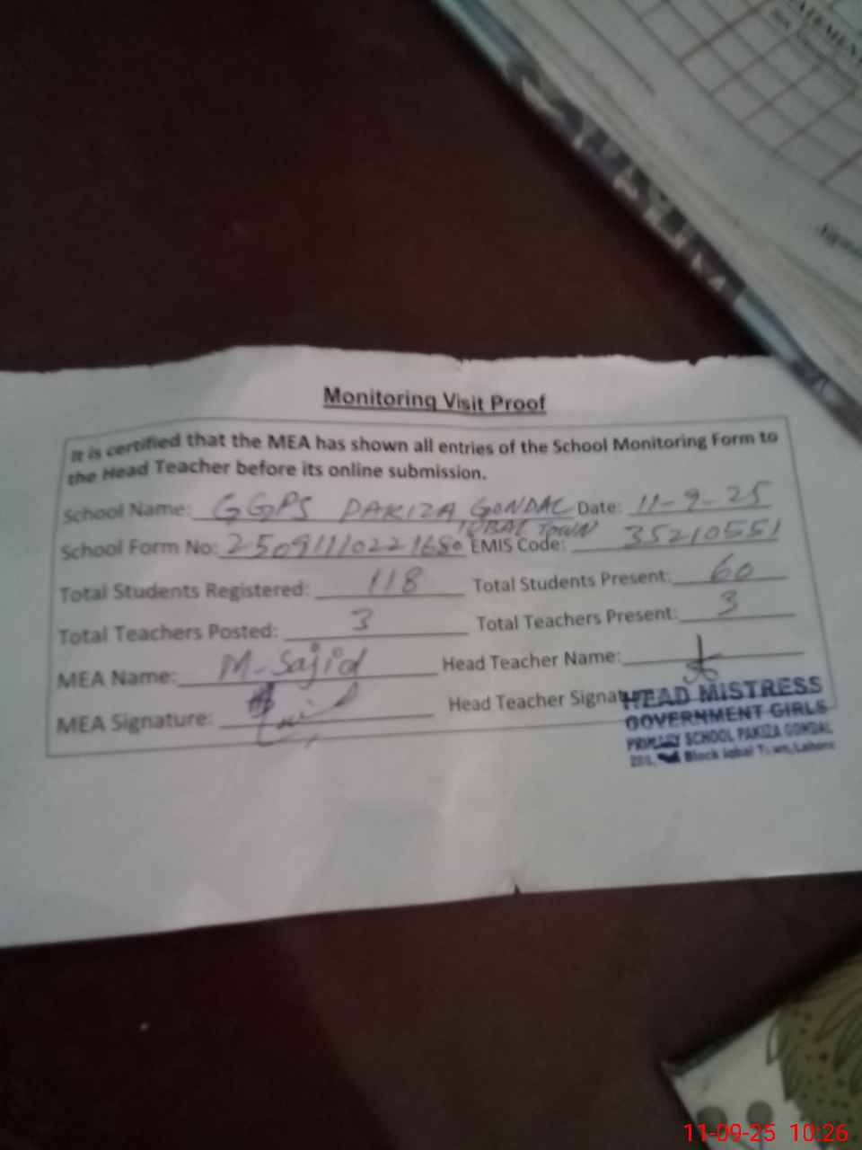 | Attendance Register | Head Teacher | MEA with School | Visit Proof |