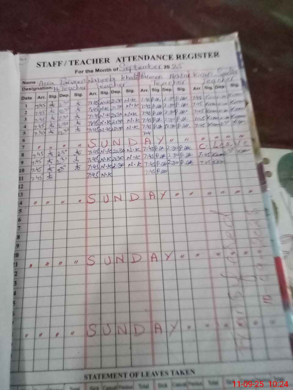 | Leave | Duty | Absent | Maternity | Medical | Ex- Pak |